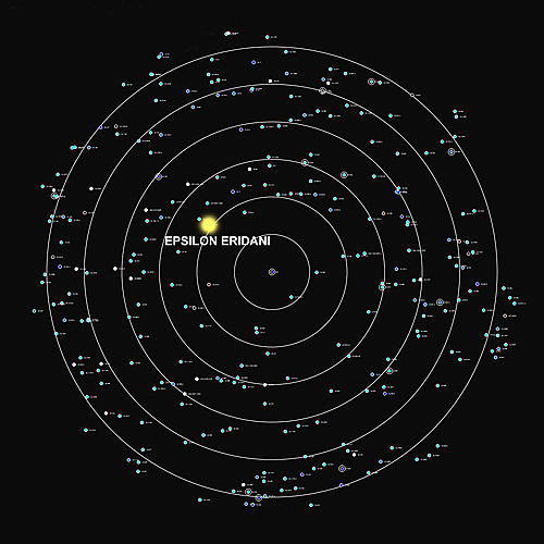 EPSILON ERIDANI is a relatively young orange-red dwarf with a system that is still in the process of forming.  Yet there are four distinct planets in orbit, including three small rocky worlds and one gas giant.  There is also an inner asteroid belt, an outer asteroid belt, and an icy cometary belt at the distant edge of the system.  Though the star itself is somewhat deficient in heavier metals compared to Sol, the innermost regions are rich in valuable Eridium ore.